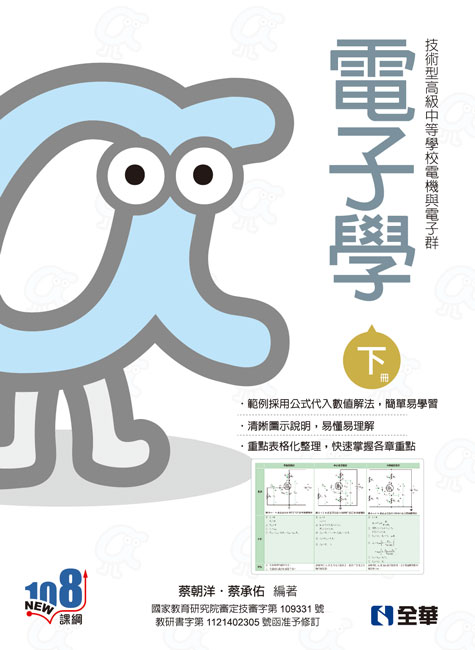 一、本書係依據中華民國一○七年教育部發布之十二年國民基本教育技術型高級中等學校群科課程綱要-電機與電子群「電子學」編輯而成。全書共分二冊,供「資訊科、電子科、航空電子科、電子通信科、電機科、控制科、冷凍空調科、電機空調科」第二學年第一、二學期,每週上課三節三學分教學之用。