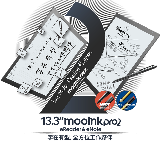 ![螢幕硬體規格133 arta 1250T 電子紙顯示螢幕16502200(206 ppi)電容式 + 電磁式(支援電磁感應EMR 手寫筆)雙觸控,16灰階無閱讀燈翻頁觸控螢幕翻頁(左右或上下滑動翻頁點擊翻頁)螢幕光源無重量尺寸368克(不含保護殼)303 cm 224 cm 0.57 cm儲存容量連接埠128 GB(使用者至少可用116GB)USB 2.0 Type CCPU1.8 GHz 4 coreRAM2GB DDR4作業系統Android 9Wi-Fi藍牙NFCIEEE 802.11ab/g/n/ac,MIMO 2.4G, 5 GHzBT 5.0,可外接藍牙鍵盤(Android系統)、藍牙耳機、藍牙翻頁器等[註1]支援 MIFARE(台灣悠遊卡)、Felica(香港八達通、日本 Suica卡)解鎖螢幕陀螺儀3D 陀螺儀傳感器電池2000mAh待機時間最長達 21 天,依使用頻率及方式而異充電時間充飽約2.5 小時7小時[註2]使用溫度攝氏 0 ~ 40 度載波頻率資訊輸入法2.4G 2.412 ~ 2.462 GHz5G 5.18~5.24 GHz, 5.26~5.32 GHz, 5.50~5.70 GHz, 5.745 ~5.825 GHz系統功能手寫、倉頡、速成、注音、拼音、英文對比度加粗、彩圖、漫畫、文字等7種對比度情境設定訂休眠圖支援 PNG、JPG、JPEG 格式螢幕鎖支援密碼、NFC 解鎖[註1]支援 HID、A2DP 規範、藍牙低功耗(BLE)技術[註2]使用充電器(支援PD快充,9V/12V)充飽電,約2.5 小時;使用USB線(5V/500mA),約7小時看書三大應用程式(功能將隨系統更新增加)支援 Readmoo 讀墨電子書:流式、版式、聲書(需透過藍牙音訊裝置)流式書籍訂排版:字體大小、行距、排/直排轉換、單欄 / 雙欄轉換、左右邊界、對齊方式、強制黑字 多種字體,包含:華康青花黑體、華康明體、華康楷體、華康仿宋體、思源宋體、芫荽體、注音芫荽體等自行匯入字體劃線註記書籍內容搜尋內建英漢/漢英字典,線上搜尋網頁、萌典、維基百科版式書籍單頁/雙頁切換縮圖目錄書籍目錄、書籤、書內塗鴉(支援手寫筆).翻頁手勢:滑動(上下、左右)、點擊.自訂翻頁區塊看書畫面直持/橫持自動旋轉跨裝置雲端同步:書籍文件、書籤、劃線註記、閱讀紀錄、書內塗鴉.離線閱讀(支援雲端同步)總覽頁:顯示最近閱讀的書籍/雜誌/聲書、今日閱讀目標與進度、馬拉松活動等資訊書櫃管理:書櫃切換(書籍/雜誌/系列/標籤...)、篩選、排序、搜尋家庭帳號書籍互借買書:瀏覽、試讀、購買、訂閱電子書(支援信用卡綁定、儲值金與領書額度換書)閱歷:圖表式呈現個人閱讀紀錄筆記可匯入個人文件,支援格式:EPUB(雲端書櫃匯入或USB 線傳入),TXT / DOCX / PDF(雲端匯入)支援格式:PDF手寫筆記 內建 12 種筆記範本、自訂筆記範本 PDF 檔案手寫註記、螢光筆劃線自訂筆觸(鉛筆、鋼筆、毛筆、螢光筆 )、筆劃粗細、顏色手動儲存手勢上滑/下滑刷新手寫內容圈選編輯(剪下、複製、拖曳、貼上)文字與記號搜尋、局部放大快速跳頁、縮圖目錄雙文件並排顯示、左右對調資料夾管理自訂手寫筆按鈕PDF檔案、筆記、資料夾匯出:USB 線連接電腦 / Email / mooInk Pro Connect App(相容於 Android 6.0 以上/iOS 13.0以上) PDF 檔案劃線文字匯出(USB線連接電腦/Email)打字文字輸入、自動儲存自訂字體大小支援外接藍牙鍵盤(Android系統)打字畫面橫持/直持自動旋轉TXT 檔案匯出:USB線連接電腦/ Email•支援格式:TXT of Stylusmoolnk Pro 2內附電磁式手寫筆筆桿/筆夾材質ABS + PC 熱塑性塑膠尺寸13.8 cm x 0.8 cm重量7.2克感壓階級4096功能按鈕頂端按鈕(預設為橡皮擦)、側邊按鈕(預設為螢光筆)配件筆芯(0.7 mm 黑色/鋼珠筆筆觸 x 2、0.6 mm 白色/鉛筆筆觸x2)、筆芯moolnk Pro 213.3 E Ink 電子紙螢幕電容式觸控 + 電磁式手寫(電勝磁感應)螢幕moolnk Pro13.3 E Ink 電子紙螢幕電容式觸控1650x2200(206 ppi)1650x2200(206 ppi)解析度30.3 cm x 22.4 cm x 0.57 cm尺寸30.3 cm x 22.4 cm x 0.57 cm368克重量352克1.8 GHz x 4 coreCPU1.2 GHz x 4 core2GB DDR4RAM2GB DDR3128 GB32 GB儲存容量(使用者至少可用 116 GB )BT 5.0支援藍牙低功耗(BLE)技術(使用者至少可用 25 GB )BT 4.2藍牙不支援藍牙低功耗(BLE)技術悠遊卡(NFC)解鎖螢幕無USB 2.0 Type-C連接埠Micro USB讀墨超過 26 萬本繁中書籍有有流式書籍橫/直排一鍵轉換有有書內塗鴉(跨裝置雲端同步)有有閱讀畫面直/橫持自動旋轉無有家庭帳號書籍互借有鉛筆、鋼筆、毛筆、螢光筆自訂手寫筆觸鉛筆有行動版 App 傳檔有打字 App有無(可輸入文字,自動儲存 )手寫、倉頡、速成、注音、拼中文輸入法倉頡、速成、注音、拼音音mooInk Pro 2 內附手寫筆電磁式(支援4096階感壓)種類7.2 g重量電池不需要不需要充電時間moolnk Pro 內附手寫筆電容式16 g144 mAh待機時間最長達30天充飽需3小時(以5V 1A計算)頂端按鈕(預設橡皮擦)側邊按鈕(預設螢光筆功能按鈕筆)(使用者可自訂)側邊二按鈕(橡皮擦、螢光(固定功能)0.7 mm 黑色/鋼珠筆筆觸0.7 mm 黑色/鋼珠筆筆觸筆芯0.6 mm 白色/鉛筆筆觸0.7 mm 灰色/鉛筆筆觸](https://fs-a.ecimg.tw/img/projects/personal/v0/upload_file/US00019401/13.3Pro-2.jpg)