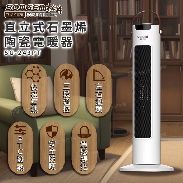 ✦暖爐六大特點,石墨烯導熱、PTC發熱、三段控溫、左右擺頭、自動斷電、皮質提手