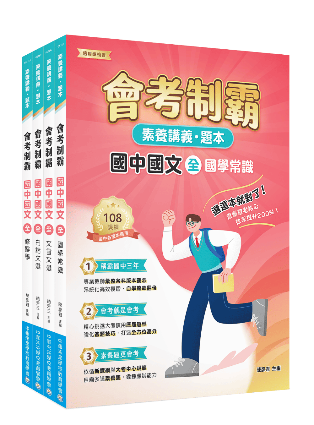 本系列套書收錄「國學常識」、「白話文選」、「文言文選」、「修辭學」幫助學生從國文課程各面向著手進行複習,教師亦能使用本系列書籍展開課程教學。