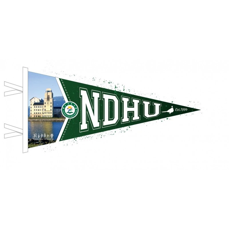 運用東華LOGO的基本色系連結NDHU與東華大學中文字,無論本地生或外籍生都緊密結合學校的精神象徵,綠色也代表活力及生命力,這樣的三角旗更能凸顯東華的活躍。