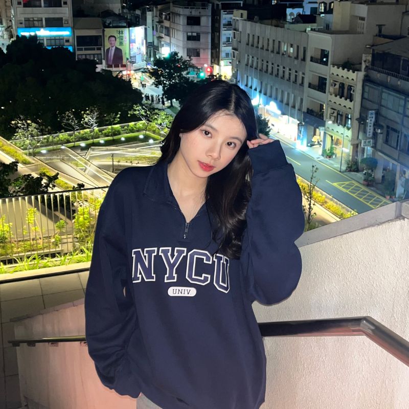 比起一般大學T,更具設計感的半開拉鍊搭配立領剪裁,保暖同時也能自由調整穿搭氛圍。
