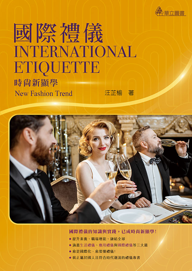 本書國際禮儀—時尚新顯學,涵蓋生活禮儀(食、衣、住、行、育、樂)、應用禮儀(職場、社交、書信)與國際禮儀(觀光、會展、禁忌)等三大篇,除以理論原則論述、更增添生動照片,相較於一般國際禮儀書籍而言,本書教學講授為主、實務演練為輔,就觀光學群之學子或一般行業所需,內容豐富廣泛、撰寫簡明扼要、圖文並陳、由淺入深、易於學習。