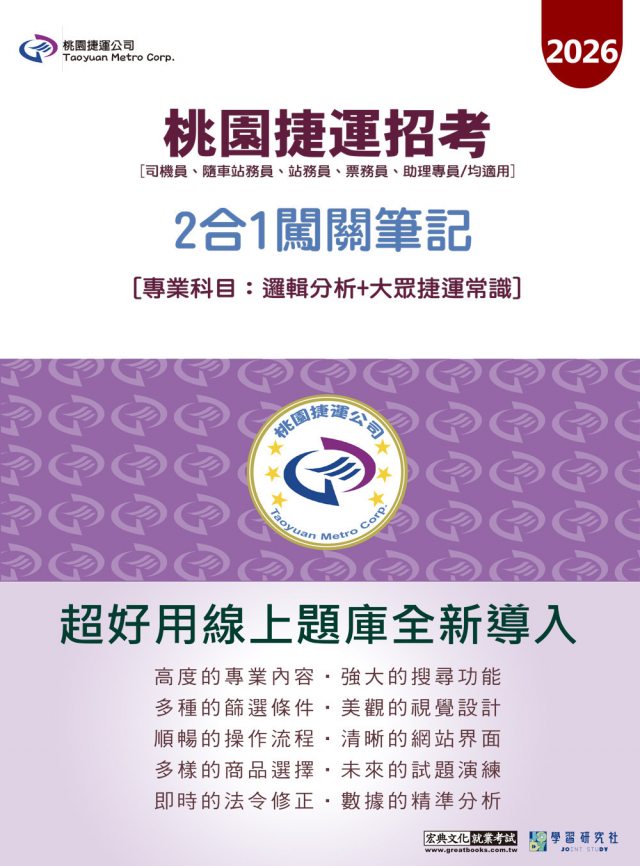 專為「桃園捷運招考」設計的2合1筆記,科目有:邏輯分析、大眾捷運常識。司機員、隨車站務員、站務員、票務員、助理專員/均適用。