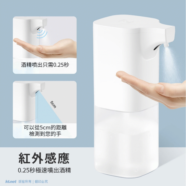 紅外線感應技術,快速感應時間僅為0.25s, 手在感應區域(距離為0-5cm)時,自動噴出綿密的酒精,清潔雙手。