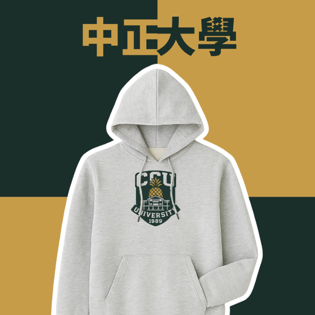 • 以粗獷懷舊字體呈現,搭配中央金黃色鳳梨圖案,象徵中正大學所在地——嘉義民雄,強化地緣認同。
