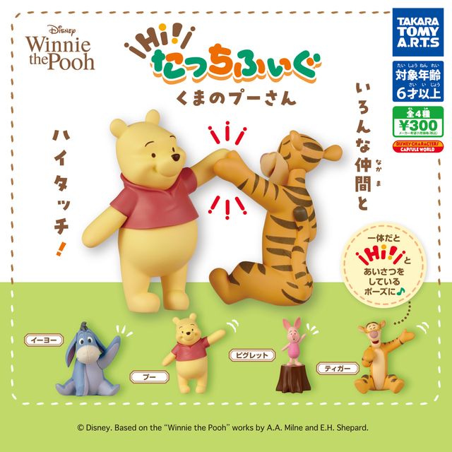 100エーカーの森の仲間たちが「Hi!」とあいさつしているようなポージングがキュートな、新しいフィギュアシリーズ「Hi!たっちふぃぐ」が誕生。1体だと「Hi!」とあいさつしているポージングに、2体集めるとハイタッチしているポージングで飾れる2WAY仕様となっています。サイズは約5cm。