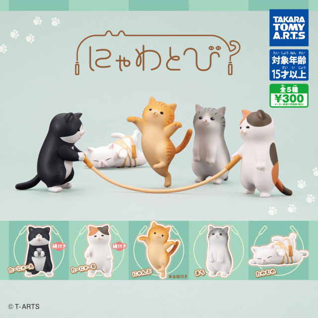 そろえて楽しい、ネコちゃんたち! かわいいネコたちが、大縄飛びをしているキュートでゆかいなフィギュアです。優しいつぶらない瞳もかわいすぎ♥ 「にゃんぷ」は台座付きです。「たーにゃーA」、「たーにゃーB」には縄が付きます。サイズは約5cm。