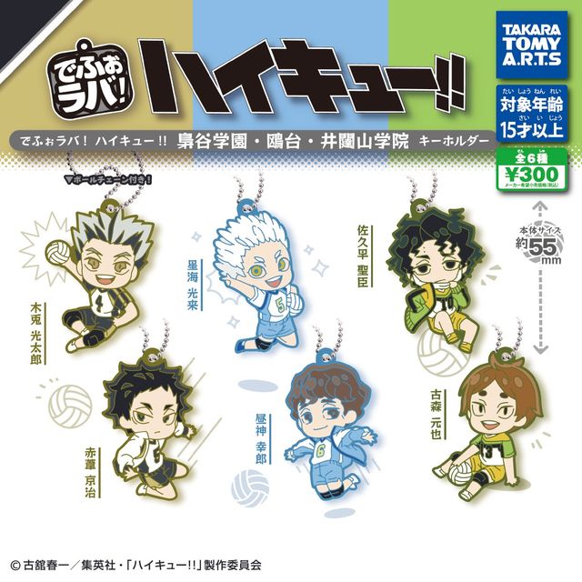 タカラトミーアーツのオリジナルデフォルメ「でふぉラバ!」のイラストを使用した、『ハイキュー!!』のラバーキーホルダー第4弾です。今作は梟谷学園、鴎台、井闥山学院のメンバーをピックアップ。キャラクターそれぞれの個性豊かな表情やポーズに注目です! 本体サイズは高さ約5.5cm。