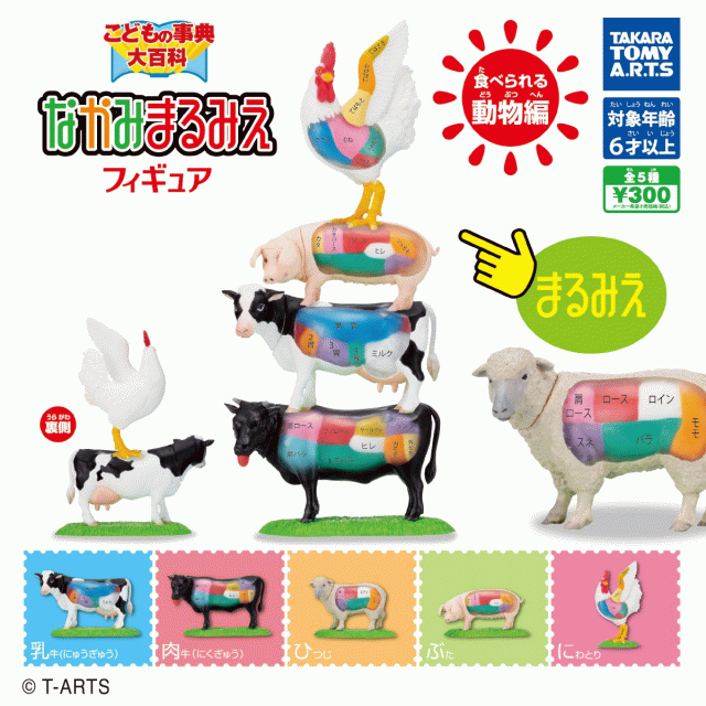 ※角色陣容:乳牛、肉牛、羊、豬和雞,皆附有草地設計的底座,可以好好地擺放展示,清楚看見動物們的內部構造、熟悉的動物的身體構造...是不是非常地獄呢?