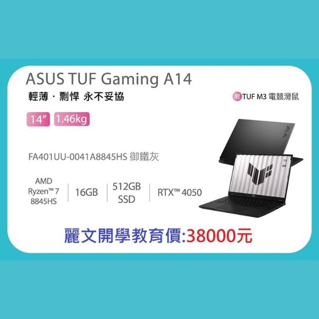 ⭐處理器AMD Ryzen 7 8845HS 內建記憶體:8GB*2 儲存空間:512GB SSD 獨顯:NVIDIA® GeForce RTX™ 4050 御鐵灰 型號: FA401UU-0041A8845HS