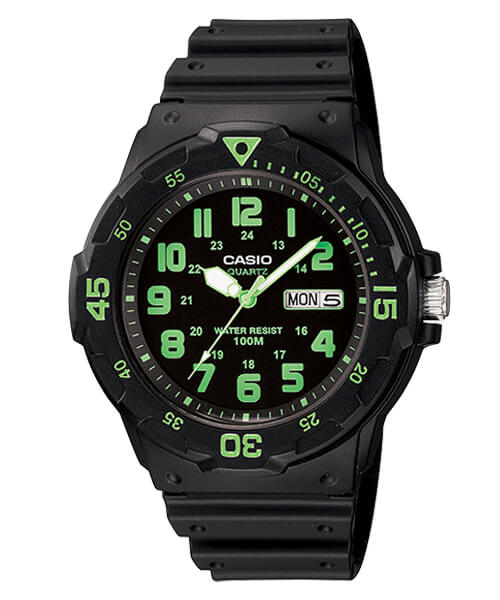 潛水風DIVER LOOK的MRW-200H系列,簡潔顯眼的三針設計與整點時刻,錶圈的部分可旋轉作為計時用途,三點鐘方向獨立設計日期與星期顯示窗,防水程度達100米。