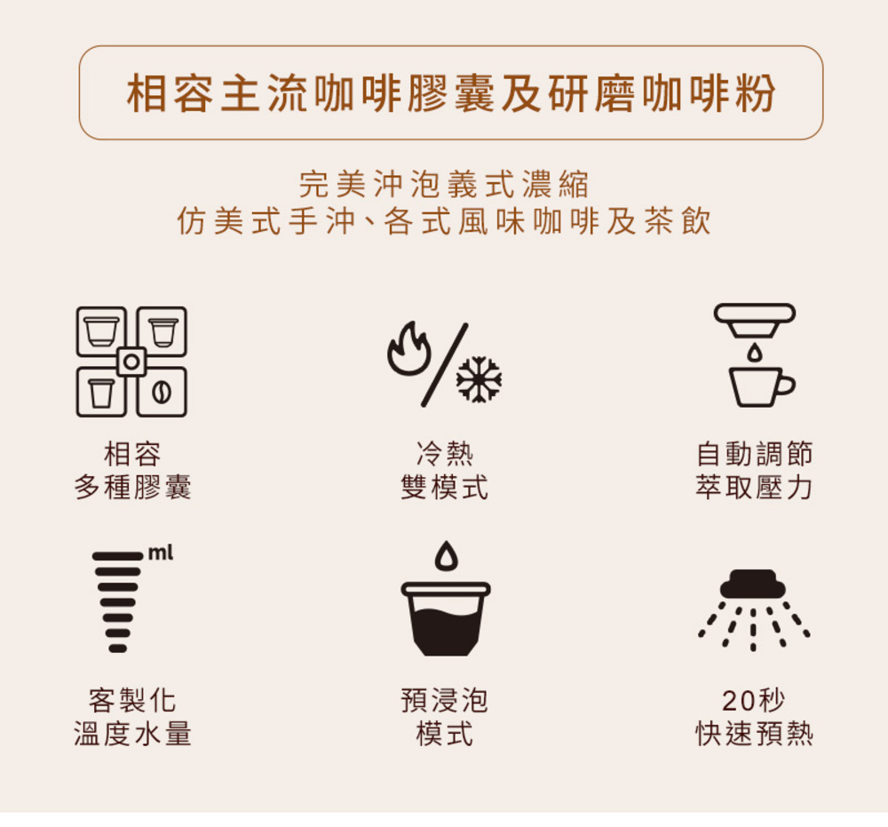 除了能相容市面主流膠囊咖啡 — NESPRESSO Original 系列膠囊、 NESCAFE Dolce Gusto 膠囊、K-cup 膠囊,還能自行填入喜歡的咖啡粉。咖啡機的選擇不再受膠囊限制!