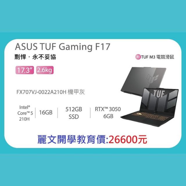 ⭐處理器:5 Processor 210H 獨顯:RTX™ 3050 規格:FX707VJ-0022A210H 詳細規格🔻
