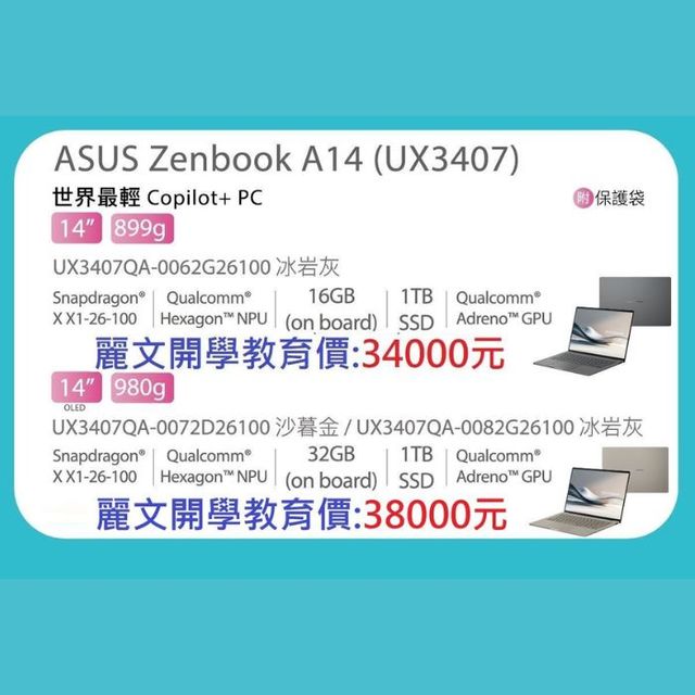![電池測試 ASUS 於2024年1月以1080p 影片播放使用情境執行測試測試組態ASUS Zenbook A14 (U3407FHD OLED Snapdragon® X處理器1TB SSD32 GB RAM 電池。測試設定WiFi停用鍵盤背光停用Windows 電源模式設定為平衡螢幕亮度設定為150cd/m2搭配預設音量耳機。實際電池續航力依據產品組態使用情形操作條件及電源管理設定而有不同。電池續航力會隨著電池的使用壽命而減少。電池測試 ASUS 於2024年11月在連線至Wi-Fi之情況下的網頁瀏覽使用情境執行測試測試內容包括 YouTube影片播放網頁瀏覽以及透過Outlook 存取電子郵件等活動。測試組態:ASUS Zenbook A14 (UX3407)、FHDOLED 螢幕、 Snapdragon X 處理器、1 TB SSD、16 GB RAM、70Wh 電池。測試設定:WiFi啟用且連線、鍵盤背光停用、Windows 電源模式設定為平衡、螢幕亮度設定為150 cd/m2、搭配預設音量耳機。實際電池續航力依據產品組態、使用情形、操作條件及電源管理設定而有不同。電池續航力會隨著電池的使用壽命而減少。電池測試 ASUS 於2024年11月在連線至Wi-Fi之情況下的線上影片 (YouTube 影片播放情境執行測試。測試組態:ASUS Zenbook A14 (UX3407)、FHD OLED 螢幕、 Snapdragon® X處理器、1TB SSD、32GB RAM、70Wh電池。測試設定:WiFi 啟用且連線、鍵盤背光停用、Windows 電源模式設定為平衡、螢幕亮度設定為150cd/m2、搭配 15% 音量耳機。實際電池續航力依據產品組態、使用情形、操作條件及電源管理設定而有不同。電池續航力會隨著電池的使用壽命而減少。1 重量可依據規格而有不同。2. 此聲明乃依據摩擦、及抗污測試之結果。如需測試情境的詳細資訊請參閱下方第4、5、6點說明。3. 在摩擦測試中材質同一處遭來回摩擦超過18000次然而表面毫髮無傷。4. 在墜落測試中筆記型電腦於50公分高度從6個不同角度直接墜落至硬質表面。5. 在抗污測試中塗抹各種顏色的於 Ceraluminum™ 板材上並放置數小時事後可輕鬆去除且不留任何污漬。6. 測試規則同時包括軍規等級標準與 ASUS 品質測試標準的規定並因裝置而異。MIL-STD-810H 測試僅針對特定 ASUS產品進行。請注意:MIL-STD-810H 測試有助於確保 ASUS 產品的品質但並不表示特別適合軍事用途。該測試是在實驗室條件下進行。任何因嘗試重現上述測試條件而造成的損壞視為意外,不在ASUS 的標準保固範圍內。ASUS Premium Care 提供額外保固。7. 此數據乃依據理論效能。實際效能依據實際環境條件而有不同。8. 電池續航力最長達32小時。電池測試 ASUS 於2024年8月7日以1080p 影片播放使用情境執行測試。測試組態:Zenbook A14 (UX3407)、FHD OLED 螢幕、 Qualcomm Snapdragon®X處理器、1 TB SSD 32 GB RAM。測試設定:開啟WiFi但連線(未連線至任何存取點)、Windows 電源方案設定為平衡、螢幕亮度設定為150cd/m2。實際電池續航力依據產品組態、使用情形、操作條件及電源管理設定而有不同。電池續航力會隨著電池的使用壽命而減少。9. WiFi 6E 可用性可能依據國家及其特定法規而異。此功能僅在Windows 11 以上版本提供支援。10. 多重連接模式可讓筆電自動切換到最強的 Wi-Fi 訊號,前提是路由器也必須相容於 Wi-Fi7。11. 此資料來自 ASUS 實驗室測試,測試標準為模擬日常充電頻率。實際電池續航力依據產品組態、使用模式、操作條件及電源管理設定而有不同。電池續航力將隨時間自然減少。更全面的詳細資訊請參見以下連結:https://www.asus.com/support/faq/105111412. 回顧(預覽版)功能即將在稍後透過 Windows 更新推出,時間將因裝置和地區而異。針對特定語言進行優化(英文、中文(繁體)、法文、德文、日文和西班牙文)。可能存在內容和儲存空間的限制。詳情請見[aka.ms/copilotpluspcs] 。13. 針對英文文字提示最佳化。使用者必須擁有 Microsoft 賬戶和網路連線才能存取雲端服務,以確保負責任使用。進一步瞭解:https://support.microsoft.com/zh-tw/windows/use-cocreator-in-paint-53857513-e36c-472d-8d4a-adbcd14b2e5414. 目前支援將 40 多種語言的視訊和音訊字幕翻譯成英文。請參閱 [aka.ms/copilotpluspcs].15. MyASUS Splendid Display P3和SRGB 色域的平均測試結果: Delta E1./-0.5,可能會依據規格而有不同。請注意,實際效能在不同的測試程序、設備和模式下也可能會有所不同。16. 與市場上一般 LCD 螢幕比較,測量 415-455nm 波長之間的藍光能量發射。17. 為了進一步為您的 OLED 筆記型電腦提供最大的保護,ASUS 提供 OLED Care 設定,例如預設開啟的像素重新整理和像素位移。請務必注意,保固期間 (可能因國家而異)若確實發生螢幕烙印問題,只要使用者未手動關閉 OLED Care 功能,ASUS 將為受影響的 OLED 筆記型電腦提供免費更換服務。18. 色溫調整功能僅適用於 OLED 型號。](https://img.pchome.com.tw/cs/items/DHAFJLA900I9HFD/i010024_1736924851.jpg)